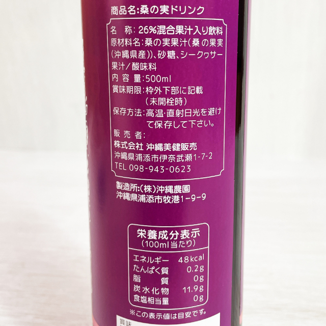 | 原材料 | 桑の実果汁(桑の果実(沖縄県産))、砂糖、シークヮーサー果実/酸味料 |