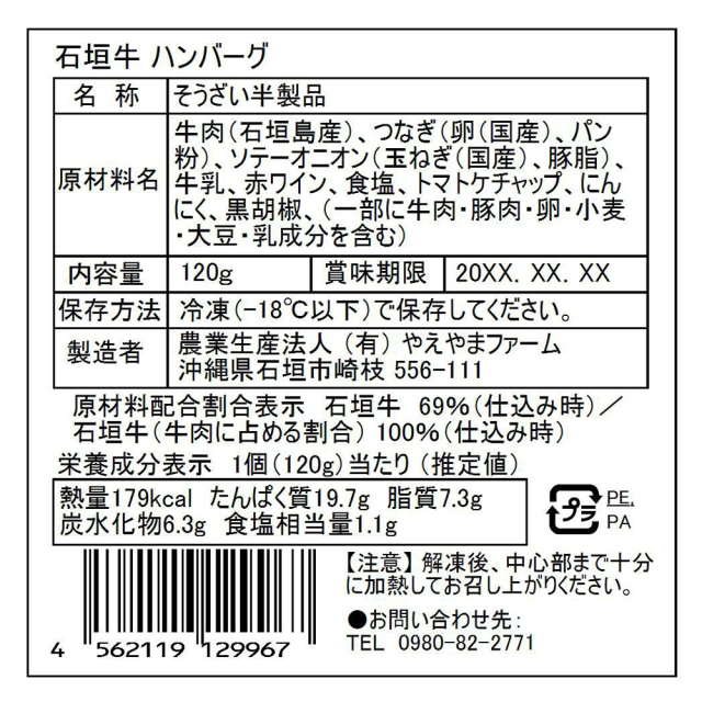 | 原材料 | 牛肉(石垣島産)、つなぎ(卵(国産)、パン粉)、ソテーオニオン(玉ねぎ(国産)、豚脂)、牛乳、赤ワイン、食塩、トマトケチャップ、にんにく、黒胡椒、(一部に牛肉・豚肉・卵・小麦・大豆・乳成分を含む) |