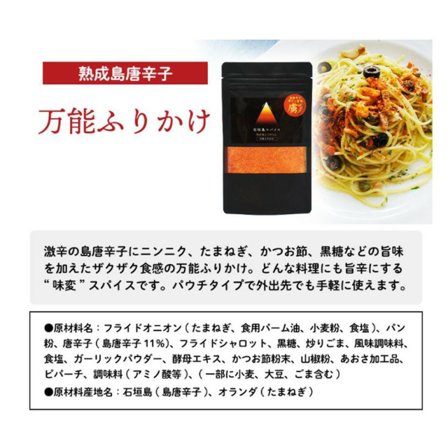 粗挽き一味:島唐辛子(沖縄県産70%、石垣島産30%) 粗挽き一味 燻製:島唐辛子(沖縄県産70%、石垣島産30%) コーレグース:泡盛(沖縄製造)、島唐辛子(沖縄県産90%、石垣島産10%)/酸味料、V.C 唐辛子スコソース:米黒酢(国内製造)、島唐辛子(沖縄県産90%、石垣島産10%)、食塩/シークワーサー香料 ペースト:紅芋ペースト、唐辛子(島唐辛子6%)、塩 万能ふりかけ:フライドオニオン(たまねぎ、食用パーム油、小麦粉、食塩)、パン粉、唐辛子粉、フライドシャロット、黒糖、炒りごま、風味調味料、島唐辛子(沖縄県産70%、石垣島産30%)食塩、ガーリックパウダー、酵母エキス、かつお節粉末、山椒粉、あおさ加工品、ピパーチ/調味料(アミノ酸等)、(一部に小麦・大豆・ごまを含む) オリーブオイル:食用オリーブ油(イタリア製造)、島唐辛子(沖縄県産70%、石垣島産30%)、乾燥にんにく |