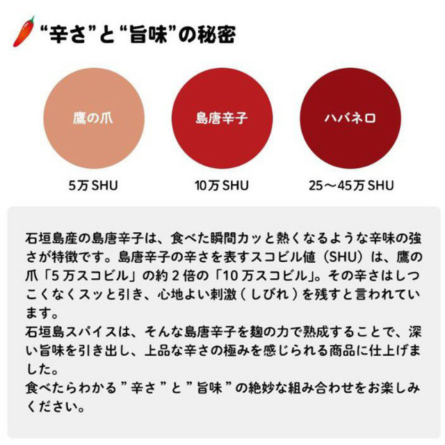 石垣島産の島唐辛子を使用して熟成されたスパイスは、旨さ極まる、辛さ100,000スコビル。 麹の力で熟成した島唐辛子が、辛さと旨味の虜にする 鷹の爪の約2倍の辛さを持つ石垣島産の島唐辛子 食べたらわかる「辛さ」と「旨味」の絶妙な組み合わせをお楽しみください。 >>粗挽き一味<< 石垣島産の島唐辛子の辛さに、麹の力で熟成した旨みが加わった一味唐辛子。 とにかく辛さをプラスしたいとき、ササッとひとふりするだけで、味がぐんと引き締まります。 お肉やうどん、お蕎麦だけでなく、アラビアータ、きんぴら、韓国料理なの料理でもお使いいただけます >>粗挽き一味 燻製<< 沖縄県産の島唐辛子の辛さに、麹の力で熟成した旨みが加わった一味唐辛子を香ばしく燻製にしました。 燻製好きのために、燻製チップにこだわり、島唐辛子との相性が良い、ヒノキチップを使用。 このヒノキチップも希少な栃木県産を使用しています。 辛味+旨味だけでなく、燻製の香ばしさも味わえる調味料です。 >>コーレグース<< 一般的な島唐辛子の泡盛漬けは、島唐辛子がそのままの形状で配合されていますが、当社では熟成島唐辛子を粉砕してから泡盛に浸漬するので辛味と旨味が多く抽出されています。 また、使用する泡盛にもこだわり、石垣島にある八重泉酒造様の泡盛を使うことで、上品且つ、芳醇な香りのする商品に仕上がりました。 沖縄そばはもちろんのこと、野菜炒めや肉料理、またお刺身など幅広くお使いいただけます。 >>唐辛子スコソース<< まろやかな酸味をもつ玄米黒酢に、辛味・旨味をもつ熟成島唐辛子および「石垣の塩」をミックスし、さらに沖縄県北部にある大宜味村(おおぎみそん)のシークワーサー果皮エキスを加えることで、爽やかな風味に仕上げました。 ピザやパスタはもちろんのこと、オムレツやナチョス、さらに野菜のドレッシングなどにお使いいただけます。 酸味・辛味・旨味・アロマが混然一体となった島のスコソースをお是非ともお試しください。 >>ペースト<< 石垣島産の紅芋(沖夢紫品種)の旨みと、島唐辛子の辛さが織りなす旨辛調味ペースト。 中国の豆板醤をヒントに、そら豆の風味に似た紅芋をバランス良く掛け合わせ、美味しさに深みを持たせました お鍋、焼肉のたれ、ポン酢、マヨネーズ、スープなどに入れるとガラリと味変できます。 また豆板醤やコチュジャンに置き換える料理のほか、ピリ辛モヤシなどの和え物にも最適です。 >>万能ふりかけ<< 激辛の島唐辛子に、ニンニク、たまねぎ、かつお節、黒糖などの旨味を加えたザクザク食感の万能ふりかけ。 どんな料理にも旨辛にする「味変」スパイスです。 パウチタイプで外出先でも手軽に使えます。 ホカホカ白ごはんを代表に、パスタやピザトーストなどアレンジひとつで、もっと美味しくなります。 >>オリーブオイル<< 希少な沖縄産島唐辛子を熟成することにより、辛味に加えて、旨味も引き出したオリーブオイルです。 にんにくチップを加え、風味とピリッときいた島唐辛子のバランスが絶妙です。 お手軽にパスタ、パン、炒め物などが美味しく作れます。 |
