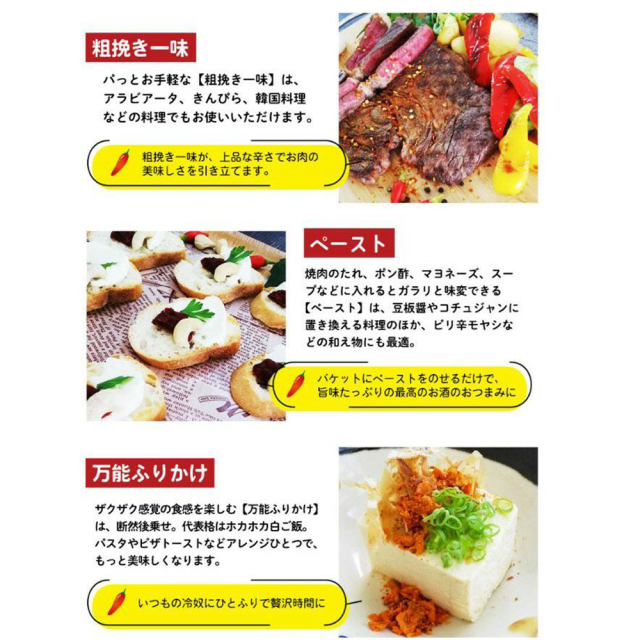 | 種類 | 粗挽き一味 / 粗挽き一味 燻製 / コーレグース / 唐辛子スコソース / ペースト / 万能ふりかけ / オリーブオイル |