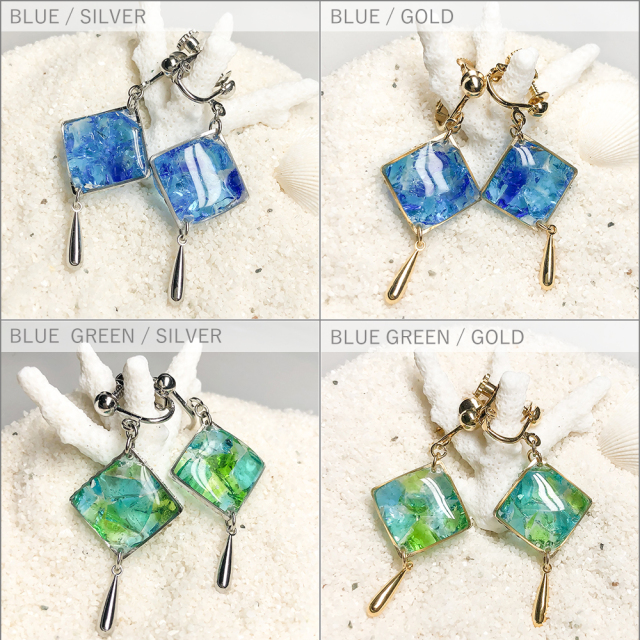琉球ガラスカレットを使ったおしゃれなイヤリングです。 沖縄の海を思わせるような綺麗なブルーの琉球ガラスカレットが特徴でゴールドとシルバーのカラーからお選びいただけます。