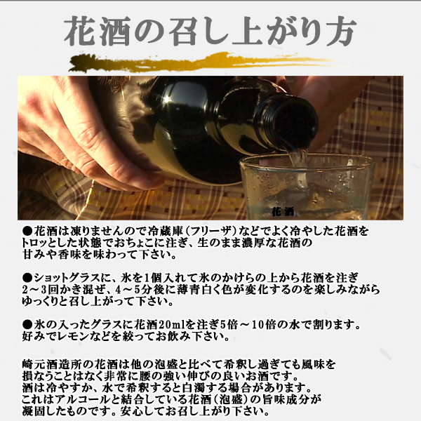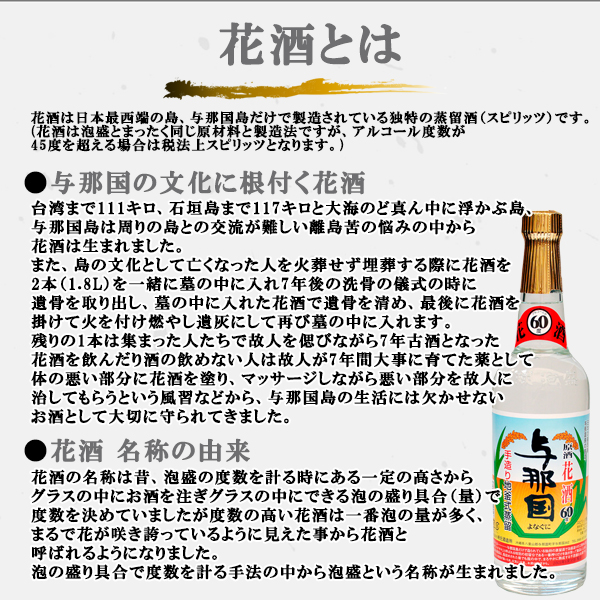 >>花酒とは<< 花酒は日本最西端の島、与那国島だけで製造されている独特の蒸留酒(スピリッツ)です。 (花酒は泡盛とまったく同じ原材料と製造法ですが、アルコール度数が45度を超える場合は税法上スピリッツとなります。) ●与那国の文化に根付く花酒 台湾まで111キロ、石垣島まで117キロと大海のど真ん中に浮かぶ島、与那国島は周りの島との交流が難しい離島苦の悩みの中から花酒は生まれました。 また、島の文化として亡くなった人を火葬せず埋葬する際に花酒を2本(1.8L)を一緒に墓の中に入れ7年後の洗骨の儀式の時に遺骨を取り出し、墓の中に入れた花酒で遺骨を清め、最後に花酒を掛けて火を付け燃やし遺灰にして再び墓の中に入れます。 残りの1本は集まった人たちで故人を偲びながら7年古酒となった花酒を飲んだり、酒の飲めない人は故人が7年間大事に育てた薬として体の悪い部分に花酒を塗り、マッサージしながら悪い部分を故人に治してもらうという風習などから、与那国島の生活には欠かせないお酒として大切に守られてきました。 ●花酒 名称の由来 花酒の名称は昔、泡盛の度数を計る時にある一定の高さからグラスの中にお酒を注ぎグラスの中にできる泡の盛り具合(量)で度数を決めていましたが度数の高い花酒は一番泡の量が多く、まるで花が咲き誇っているように見えた事から花酒と呼ばれるようになりました。 泡の盛り具合で度数を計る手法の中から泡盛という名称が生まれました。 >>花酒の召し上がり方<< ●花酒は凍りませんので冷蔵庫(フリーザ)などでよく冷やした花酒をトロッとした状態でおちょこに注ぎ、生のまま濃厚な花酒の甘みや香味を味わって下さい。 ●ショットグラスに、氷を1個入れて氷のかけらの上から花酒を注ぎ2〜3回かき混ぜ、4〜5分後に薄青白く色が変化するのを楽しみながらゆっくりと召し上がって下さい。 ●氷の入ったグラスに花酒20mlを注ぎ5倍〜10倍の水で割ります。好みでレモンなどを絞ってお飲み下さい。 崎元酒造所の花酒は他の泡盛と比べて希釈し過ぎても風味を損なうことはなく非常に腰の強い伸びの良いお酒です。 酒は冷やすか、水で希釈すると白濁する場合があります。これはアルコールと結合している花酒(泡盛)の旨味成分が凝固したものです。安心してお召し上がり下さい。 |