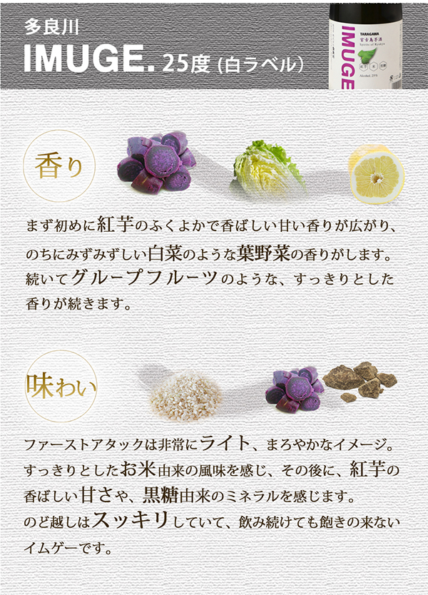 庶民の酒「IMUGE.(イムゲー)」 泡盛が琉球王朝の文化なら、IMUGE.(イムゲー)はかつての琉球庶民の文化でした。 そのイムゲーを一世紀ぶりに復活させました。 宮古島の紅芋と宮古島の黒糖を使って造った多良川のイムゲー。 すっきりのど越し、ほんのり黒糖のかおりです。 |