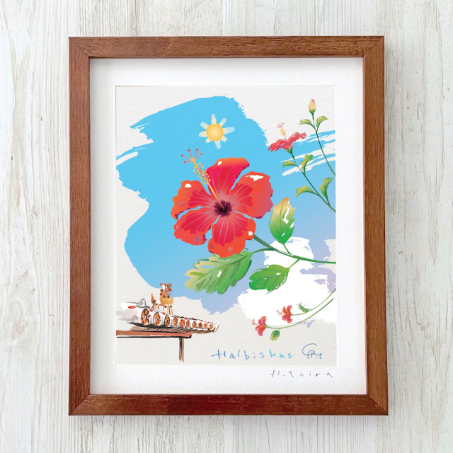 沖縄を拠点に世界で活躍するラフィックデザイナー「平良ヒトシ」が描く、色鮮やかな南国の温かい色やかたちを楽しく優しいタッチで描いた色鮮画を落ち着いた木目のフレームに入っています。