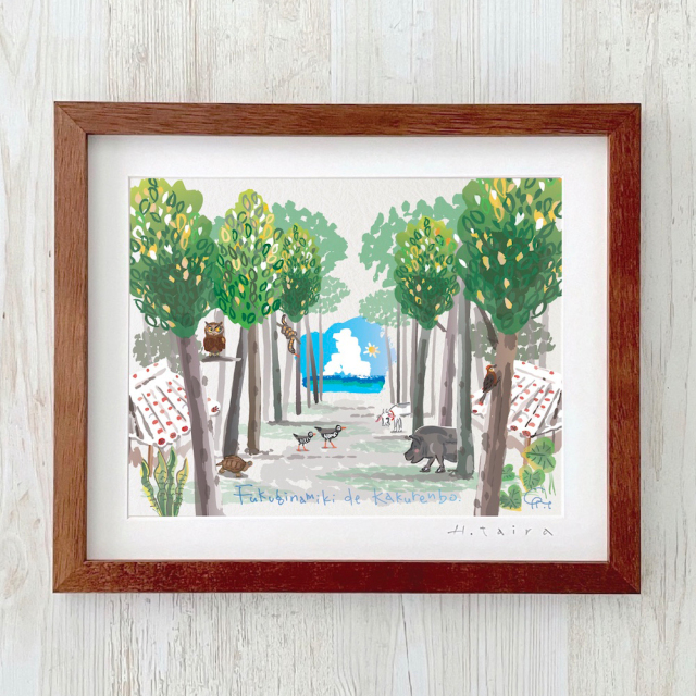 沖縄を拠点に世界で活躍するラフィックデザイナー「平良ヒトシ」が描く、色鮮やかな南国の温かい色やかたちを楽しく優しいタッチで描いた色鮮画を落ち着いた木目のフレームに入っています。