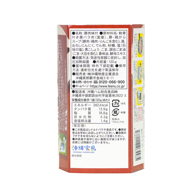 【ラフテー】豚バラ肉(輸入)、しょうゆ(小麦・大豆を含む)、砂糖、でん粉、加工黒糖、泡盛、鰹節エキス、かつお風味だし、おろし生姜、食塩、ポークエキス、酵母エキス 【味噌煮込みラフテー】豚バラ肉(スペイン産)、麦みそ(大豆を含む)、砂糖、おろししょうが、みりん、泡盛、和風調味料、酵母エキス 【塩ダレ軟骨ソーキ】軟骨付き豚バラ肉(国産)、豚・鶏がらスープ(豚肉・鶏肉・りんごを含む)、酒、おろしにんにく、でん粉、砂糖、塩(石垣の塩)、黒こしょう、ごま、調合ごま油(ごま・大豆を含む)、香味油、酵母エキス 【骨なし炙りてびち】豚足(国産)、しょうゆ(小麦・大豆を含む)、砂糖、でん粉、加工黒糖、泡盛、鰹節エキス、かつお風味だし、おろし生姜、食塩、ポークエキス、酵母エキス 【炙りスーチカー】豚バラ肉(輸入)、豚・鶏がらスープ、シークヮーサー加工辛味調味料[シークヮーサー果皮(沖縄県産)、食塩、シークヮーサー果汁(沖縄県製造)、唐辛子(沖縄県産)]、でん粉、食塩、酵母エキス、(一部に豚肉・鶏肉・リンゴを含む) 【ヤギテキ】山羊肉(オーストラリア産)、しょうゆ(小麦・大豆を含む)、野菜(にんじん、ねぎ)、砂糖、コーンスターチ、おろしにんにく、おろし生姜、泡盛、食塩、かつおだし 【ソデイカとキノコのアヒージョ】食用オリーブ油(スペイン製造)、ソデイカ(沖縄県産)、しめじ(沖縄県産)、シークヮーサー果汁[シークヮーサー(沖縄県産)]、清酒、おろしにんにく、かつお風味だし、食塩、唐辛子(輪切り)、酵母エキス |