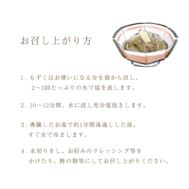 1.もずくはお使いになる分を袋から出し、2~3回たっぷりの水で塩を流します。 2.10~12分間水に浸し充分塩抜きします。 3.沸騰したお湯で約1分間湯通しした後、すぐ水で冷まします。 4.水切りをし、お好みのドレッシング等をかけたり、酢の物等にしてお召し上がりください。 |