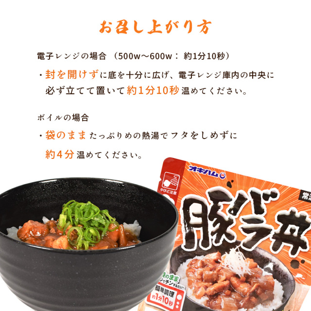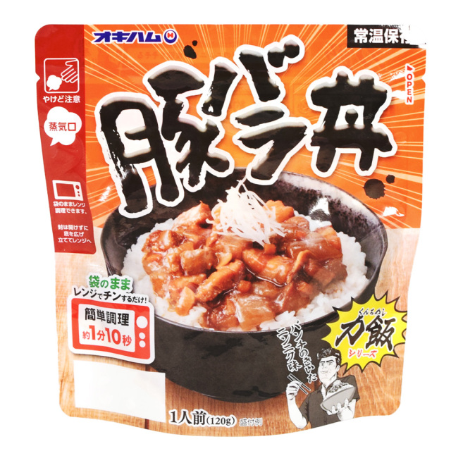 ご飯にのせて食べるどんぶり飯「力飯(くんちめし)豚バラ丼」。 ”くんち”とは沖縄の方言で「根気・スタミナ」のことを言い、「力飯」シリーズは、10代~30代の男性をターゲットとした、レンジで温めてご飯にかけて食べられる簡便食です。 「豚バラ丼」は、おろしにんにくとにんにくの芽・ガーリックチップ入りで、今までの豚バラ丼のイメージをかえる商品です。 常温保存OKなので、常備食としても使えます。 |