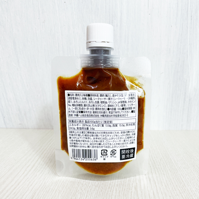 | 原材料 | 豚肉(輸入)、麦みそ(大豆(分別生産流通管理済み))、砂糖、泡盛、シークワーサー果汁(シークヮーサー(沖縄産))、おろしにんにく、おろし生姜、植物油/グリシン、pH調整剤、カゼインNa、増粘多糖類、酸化防止剤(ビタミンC)、調味料(アミノ酸等)、リゾチーム、(一部に乳成分・卵・大豆・豚肉を含む) |