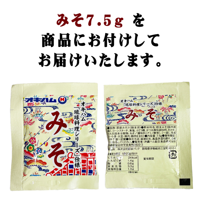ソーキ汁:野菜(大根、にんじん)、骨付き豚バラ肉(国産)、昆布、食塩/調味料(アミノ酸) 別添味噌:粉末みそ(国内製造)、コーンスターチ、食塩、ぶどう糖、かつお風味調味料、わかめ、たん白加水分解物、ねぎ/調味料(アミノ酸等)、(一部に乳成分、小麦、大豆、豚肉、鶏肉を含む) |