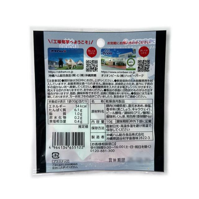 | 製品名: | 沖縄 お土産 おつまみ おやつ オリオンビール 沖縄県産豚肉 お取り寄せ グルメ 沖縄珍味 しま豚ジャーキー 黒胡椒味 ビール酵母入 10g |