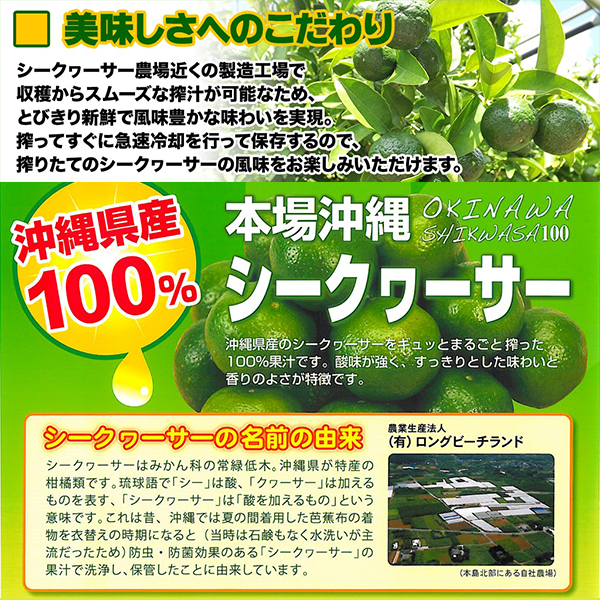 沖縄県産のシークヮーサーをギュッとまるごとしぼった100%果汁です。 酸味が強くスッキリした味わいです。 テレビや健康雑誌で注目の高いシークヮーサー果汁にはノビレチンという成分が多く含まれています。 生活習慣病の改善に期待されています。 >>お召し上がり方<< ・シークヮーサージュースとして水で5〜8倍に薄めて。 ・お刺身や焼き魚にかけて。 ・泡盛や焼酎にレモン代わりに加えて。 ・酢の物やサラダのドレッシングに。 ※ご使用前に、軽く振ってください。果汁成分の色の変化や沈殿することがありますが、品質には問題ありません。 >>健康を気にする貴方へ<< 「ノビレチン」という成分をご存知でしょうか? 健康志向の高い方々から注目を集めている「ノビレチン」とはシークヮーサーの「皮」に多く含まれる成分で、その「ノビレチン」を豊富に含んだ飲み物が出来上がりました。 |