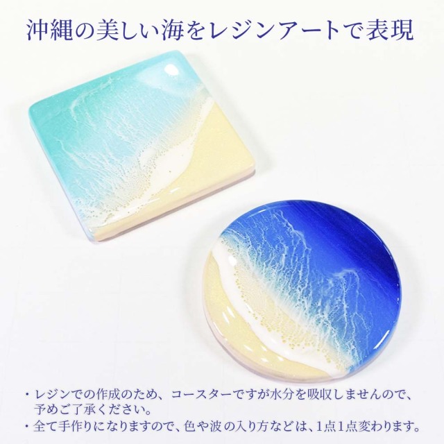 | 商品説明 | 沖縄の美しい海をレジンアートで表現。 美しい海をレジンアートで立体感を出し、リアルに表現されているのが特徴のコースター。 全て手作りになりますので、色や波の入り方などは、1点1点変わります。 レジンでの作成になりますので、コースターですが水分を吸収しませんので、予めご了承ください。 |