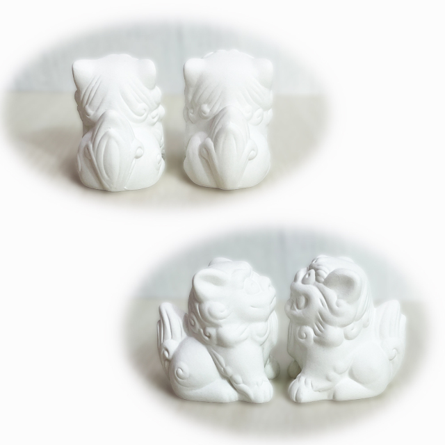 | 商品説明 | 絵付け制作体験用です。絵の具などで好きな色を塗って自分だけの特別なオリジナルの絵付け作品が作れます。※絵の具はついていません。 【シーサーとは】 シーサーのルーツは、エジプトのスフィンクスが起源ではないかと言われ、琉球王国の大航海時代(14〜15世紀)エジプト、シルクロードを経由し、中国から琉球に伝わったものと考えられています。 魔除けや守り神として沖縄全土に広まったシーサーはオスの口から幸せ(福)を取り込み、口が閉まっているメスが幸せを逃がさないと言われています。またシーサーは、魔物(マジムン)を除けるのではなく、浄化する力があるとも言われています。 沖縄の守り神は、夫婦円満の象徴でもあり贈り物にぴったりです。 【シーサーの置き方】 シーサーと向かい合って右にオス(口が開いている方)左にメス(口が閉じている方)を置きます。 神社の入口に狛犬や阿吽の像が置かれていますが、これも一種の結界で、シーサーは、狛犬や阿吽の像と同様の働きをしてくれると言われています。南の方角へ向けると火災の防止に、北東の方角へ向けると台風から家を守る水難防止になると言われてます。魔物(マジムン)は人の通り道を通って来ると言われており、玄関の内側か外側に置くかはどちらでも構いません。大事なのは、自分が置きたい所・気持ちよく飾れる場所が一番です。 【座と横の意味】 座姿:腰を据えてしっかり家を守る 横姿:尻上がりに物事がうまくいく |