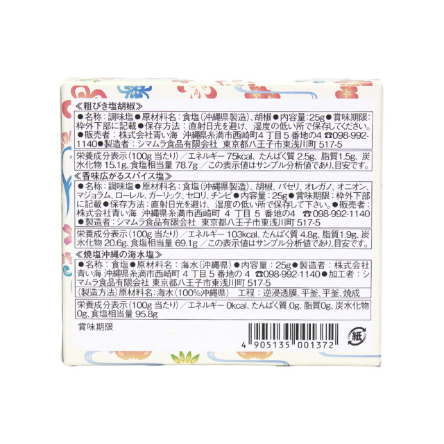 【香味広がるスパイス塩 25g】(100gあたり) エネルギー 103kcal / タンパク質 4.8g / 脂質 1.9g / 炭水化物 20.6g / 食塩相当量 69.1g 【粗びき塩胡椒 25g】(100gあたり) エネルギー 75kcal / タンパク質 2.5g / 脂質 1.5g / 炭水化物 15.1g / 食塩相当量 78.7g 【焼塩沖縄の海水塩 25g】(100gあたり) エネルギー 0kcal / タンパク質 0g / 脂質 0g / 炭水化物 0g / 食塩相当量 95.8g |
