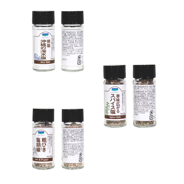 サラサラで使いやすい焼塩タイプの沖縄の海水塩、9種の香辛料が絶妙にブレンドされたスパイス塩、旨味たっぷりな粗挽き塩胡椒の3本セットです。 沖縄の海水塩と香り深いスパイスをブレンドした香味広がるスパイス塩。 沖縄の海水塩と胡椒のみで仕上げた豊かな香りと味わいがやみつきになる粗びき塩胡椒。 沖縄の海水を丁寧に炊き上げたのち、火を入れることでサラサラと使いやすく仕上げた焼塩沖縄の海水塩。 3本を使い分けて日々の料理をさらに美味しくしてみてはいかがでしょうか。 |