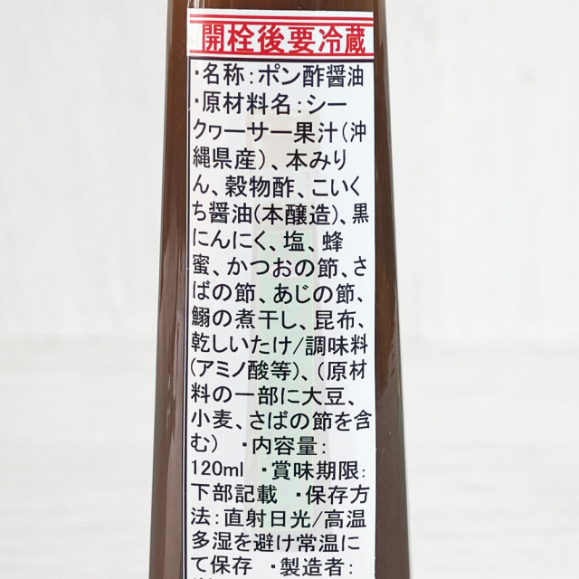 | 原材料 | シークヮーサー果汁(沖縄県産)、本みりん、穀物酢、こいくち醤油(本醸造)、黒にんにく、塩、蜂蜜、かつおの節、さばの節、あじの節、鰯の煮干し、昆布、乾しいたけ/調味料(アミノ酸等)、(原材料の一部に大豆、小麦、さばの節を含む) |