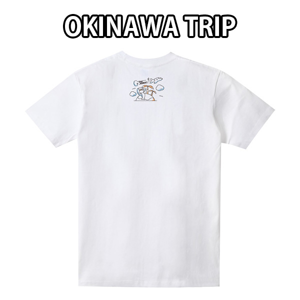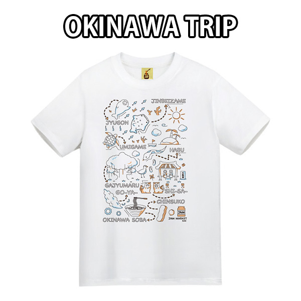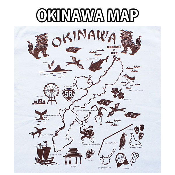 [OKINAWA TRIP] 沖縄を旅して見たいモノ、食べたいモノを詰め込んだデザイン。 イラストのタッチや色使いが昭和のファンシーショップを連想させます。 背面のジンベエザメもカワイイ!! [OKINAWA MAP] 背面に大胆な沖縄地図のデザイン。 前面には沖縄の主道の58号線の標識と沖縄地図。 左袖には羅針盤、右袖には鳥と雲。 ※プリントインクの色は茶色 |