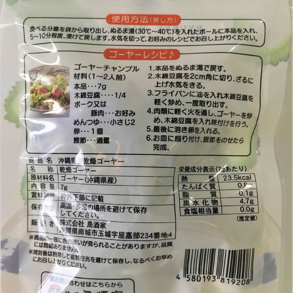 沖縄県産の野菜を乾燥させた、乾燥野菜シリーズのゴーヤーです。 スライスされた状態で乾燥しておりますので、適量を水、又はぬるま湯で戻してご使用ください。 ご家庭で沖縄の家庭料理、ゴーヤーチャンプルーを手軽に作れます! |