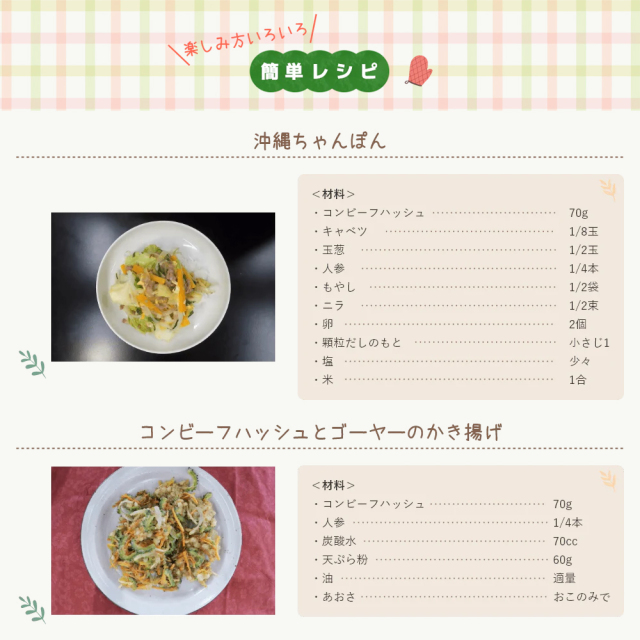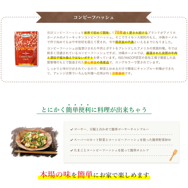 コンビーフハッシュとは、牛肉とジャガイモをブレンドして香辛料で味付けしたもの。 沖縄の家庭ではどこでも常備しているTHE・定番の常備食! ホーメル独自のオリジナル味付けをしているので、野菜と合わせて炒めるだけで失敗しらずで本格沖縄チャンプルーに仕上がります。 ごはんの上にコンビーフハッシュとマヨネーズ、生たまごをのせてレンジで温めるだけで簡単どんぶりに早変わり。 アイデア次第でレパートリーが無限に広がる、沖縄グルメ食材の中でも使い勝手のよい一品です。 牛肉に味付けをし、ポテトとブレンドした商品です。季節の野菜と合わせて手軽に調理できるのが利点です。 【パウチ】 沖縄県民がよく利用する万能食材として、缶詰からさらに使いやすいレトルトにしました。 使い終わったあとの処理も簡単便利です。 便利なレトルトパウチで、かさばらず長期保管(2年間)可能。保存食や備蓄としてもおすすめです。 【缶】 缶詰になっておりますので賞味期限も3年と長く、ストックに便利です。 【63g】 一人用の一回分の料理に使い切りサイズとなっています。 【お召上がり方】 「カレーライス」に入れると牛肉はもちろん、ポテトも入っているのでお手軽に調理ができます。 ゴーヤーと一緒に炒めてゴーヤーチャンプルーに、チャーハンの具材などとしても、、使い方次第で料理のレパートリーが広がります。 |